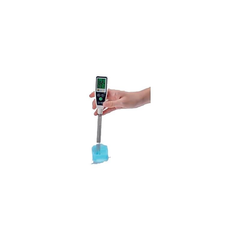 CA 10001 外形類似筆狀,一端配備 12 cm 長(zhǎng)復(fù)合電極,內(nèi)置溫度傳感器。寬大的多參數(shù)屏幕可同時(shí)顯示 pH 值和溫度值(°C 或 °F)。