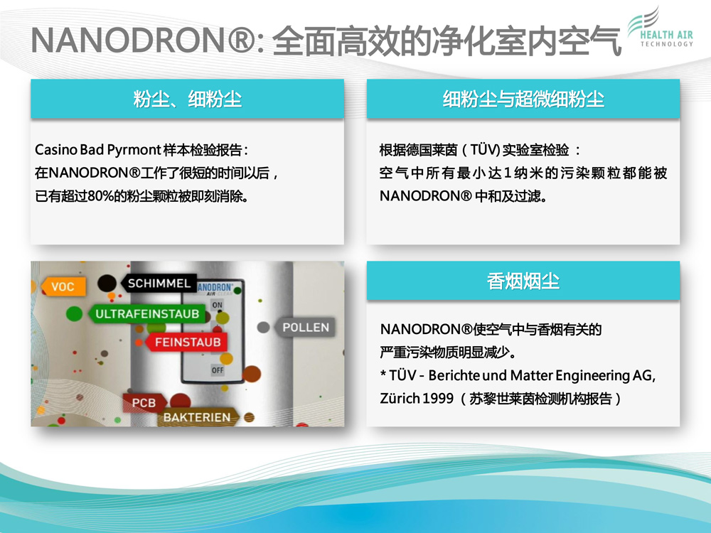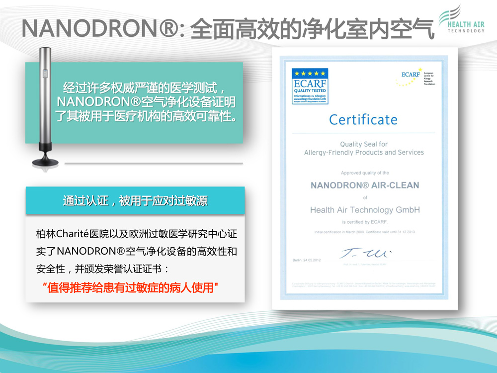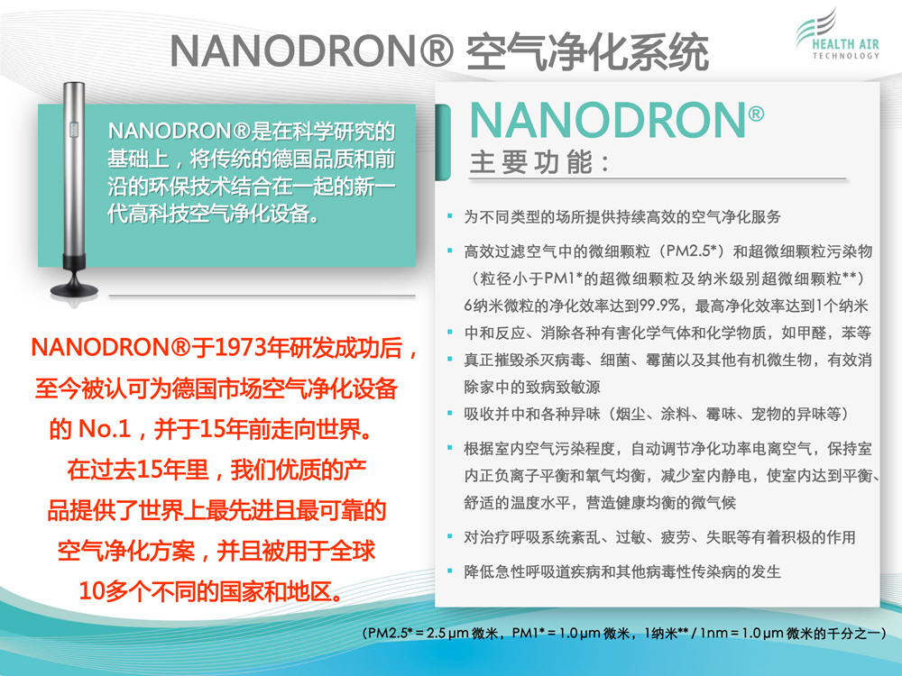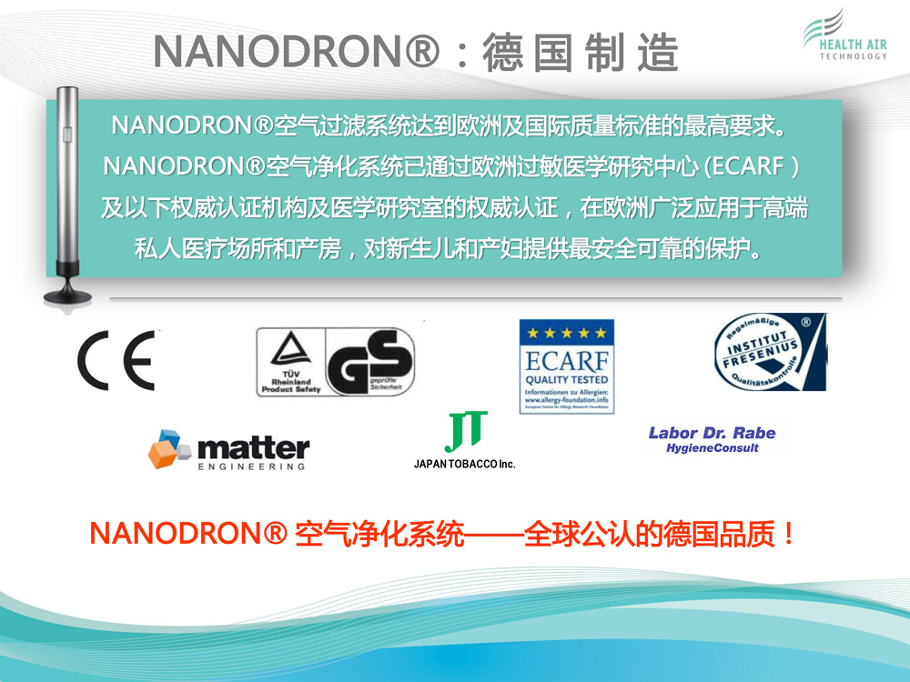 HEALTH AIR TECHNOLOGY GmbH(健康空氣技術有限公司)致力于獨特的高科技空氣凈化系統(tǒng)NANODRON?的開發(fā)、生產和銷售。 公司總部及研發(fā)與生產部門位于德國普福爾茨海姆。過去12年來,為了保證在全球范圍內維持公司特有的質量標準與技術規(guī)格,我們建立了一個銷售...[查看更多]