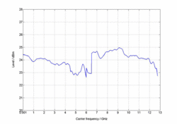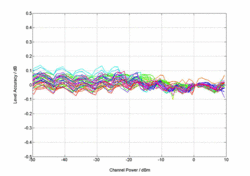 振幅為10.55dB的3GPP TM1/64信號的電平線性度;不同的顏色代表不同的射頻頻率(測量值)。