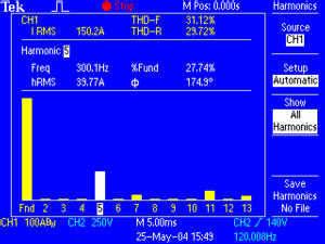 為在AC線路電壓上進行測量及檢查其對電源失真系統(tǒng)的影響,電源分析應(yīng)用軟件顯示了直到50階諧波的諧波成分,提供了相位、無功功耗和功率因數(shù)測量功能。通過4通道TPS2014或TPS2024,您可以查看三相電壓或電流。