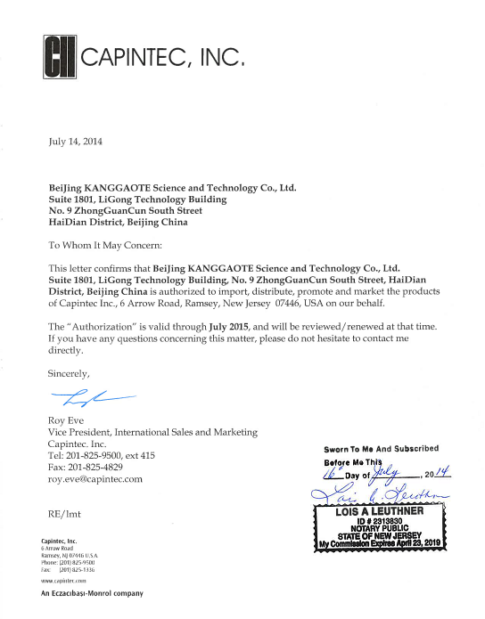 隨著我公司規(guī)模和業(yè)務(wù)的不斷壯大和擴(kuò)張,在今年7月份我公司有幸成為CAPINTEC,INC.公司在中國的代理商。從14年7月至15年7月這一年之中,北京康高特科技有限公司有權(quán)進(jìn)口、零售以及推銷CAPINTEC INC公司的儀器設(shè)備。之后CAPINTEC,INC.公司將對(duì)我公司再次進(jìn)行審核并在審核通過后再次頒發(fā)授權(quán)書。
