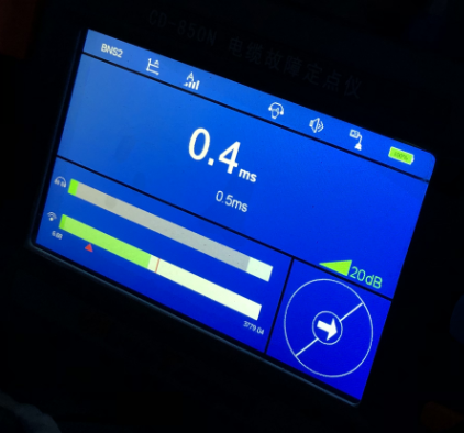 依據路徑儀和電纜故障*定點儀的測試結果,我們在161m附近找到了故障點的位置。電纜故障*定點儀在此位置上的測試結果顯示聲磁時間差為0.4ms,能夠聽到明顯的放電聲音。結合路徑儀測試結果判斷故障點在測試點正下方的1.2米處。